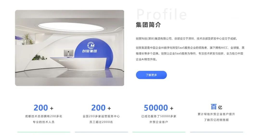 創(chuàng)貿(mào)集團旗下?lián)碛蠥ICC、全球搜、超跡AI等多個品牌,以企業(yè)SaaS服務(wù)為導(dǎo)向,專注技術(shù)研發(fā)與創(chuàng)新,全力助力中國企業(yè)AI轉(zhuǎn)型升級。全國擁有2000多名員工,成都技術(shù)總部專業(yè)的研發(fā)和技術(shù)人員已超過200名,企業(yè)擁有50+項軟件專利,以及超跡AI、全球搜、黑格增長等在內(nèi)的多個品牌和商標。